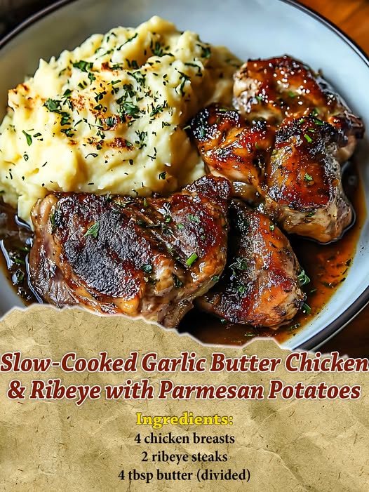 Slow-Cooked Garlic Butter Chicken & Ribeye with Parmesan Potatoes